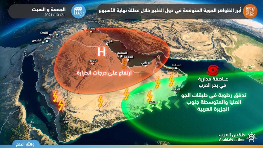 طقس العرب - تتمثل الأنظمة الجوية في الجزيرة العربية خلال عُطلة نهاية الأسبوع، بسيطرة المرتفع الجوي شبه المداري على الجزء الشرقي من الجزيرة العربية، كما يشهد بحر العرب تطور لنظام مداري، يُتوقع تطوره تدريجياً خلال عُطلة نهاية الأسبوع بحيث يكون له تأثيرات غير مُباشرة على الجزيرة العربية خلال الـ 48 ساعة القادمة، وتالياً التفاصيل: