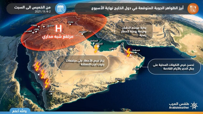 طقس العرب - تتمثل الأنظمة الجوية في الجزيرة العربية خلال الأيام القليلة القادمة، بسيطرة للمرتفع الجوي شبه المداري في المناطق الشمالية الشرقية منها، ما يضمن ارتفاع درجات الحرارة في تلك المناطق، تزامناً مع سيادة أحوال جوية غير مستقرة في جنوب غرب السعودية وجبال الحجر في سلطنة عُمان بالإضافة إلي بداية ما يعرف محلياً بموسم الحقبان في قطر، وتالياً التفاصيل: