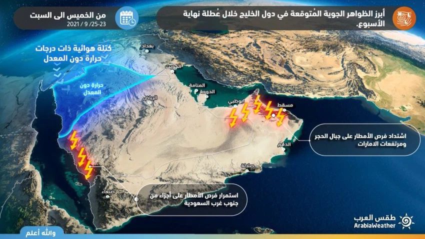 طقس العرب - تتمثل الأنظمة الجوية في الجزيرة العربية خلال الأيام القليلة القادمة، باستمرار ضعف المرتفع الجوي شبه المداري على جميع أنحاء الجزيرة العربية بحيث تكون درجات الحرارة حول معدلاتها الاعتادية، في حين تكون درجات الحرارة أقل بشكلٍ ملحوظ في في المناطق الشمالية والشمالية الغربية من السعودية، كما تستمر فُرص الأمطار جنوب غرب السعودية ويتزايد فرص الأمطار على جبال الحجر وأجزاء من الامارات بمشيئة الله، وتالياً التفاصيل:
