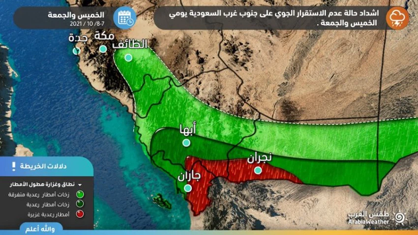 ويُتوقع هطول أمطار رعدية شديدة الغزارة تُغطي معظم مرتفعات جازان وعسير، لا سيما المرتفعات الجنوبية المتاخمة للحدود مع اليمن، وسط تحذيرات جدية من احتمالية تعرض بعض هذه المناطق للسيول الجارفة نظراً لغزارة الهطول المطري المتوقع.