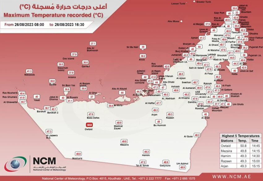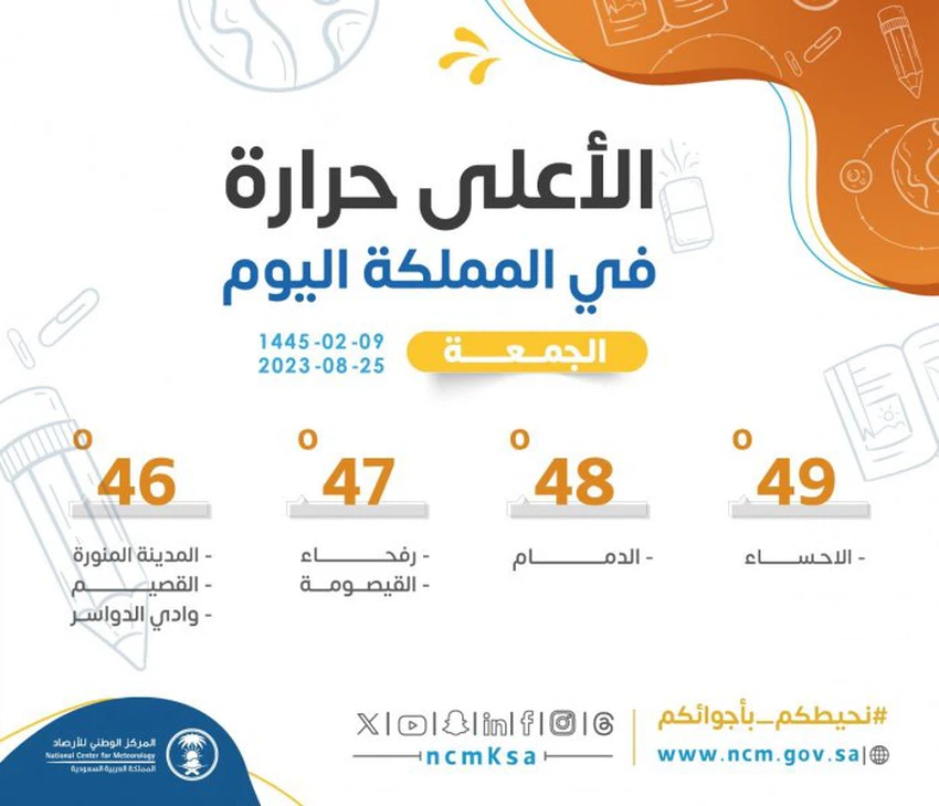 و كذلك الحال في المملكة السعودية لا تزال تُسجل العديد من المُحافظات الشرقية درجات حرارة تقترب من 50 درجة مئوية بحسب محطات الرصد الجوي الخاصة بالمركز الوطني للأرصاد.