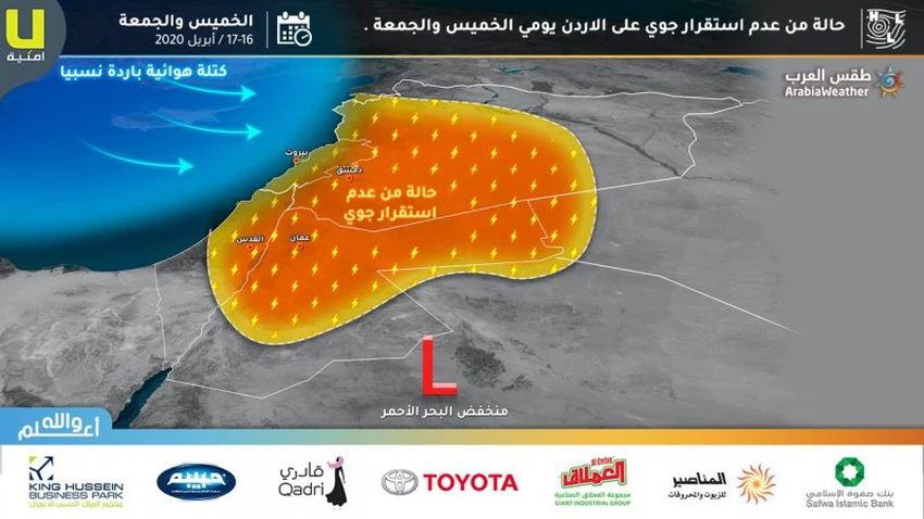 مع بداية يوم الخميس تبقى درجات الحرارة حول معدلاتها العامة او أعلى بقليل ويكون الطقس ربيعي دافئ بشكل عام في معظم المناطق، أما مع ساعات العصر فتتهيأ الفرصة بشكل تدريحي لهطول زخات رعدية من الأمطار في مناطق عشوائية من المملكة في مقدمة لمنخض جوي قادم من البحر الأبيض المتوسط يؤثر على المملكة على هيئة حالة من عدم الاستقرار الجوي