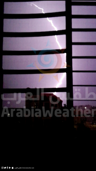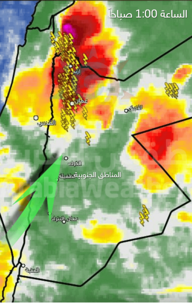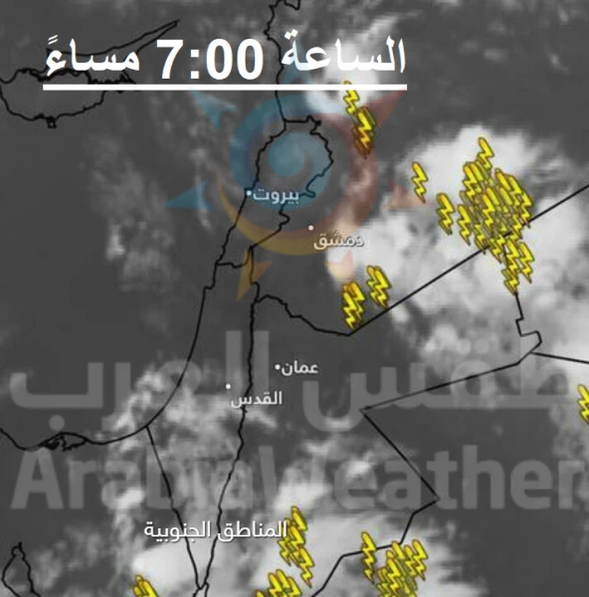 رصد مرصد البروق الخاص بطقس العرب خمسة عشر الف وضمة برق في الأردن وفلسطين خلال الحالة