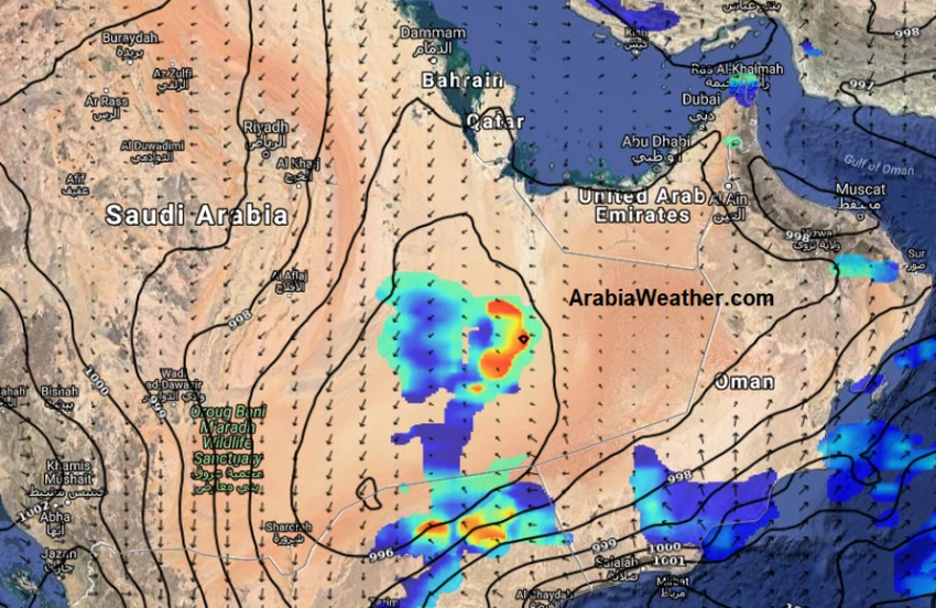 وفي التفاصيل، فتندفع تيارات هوائية محملة بكميات جيدة من الرطوبة النسبية في طبقات الجو المتوسطة والعالية، تؤدي الى تكاثر السحب ذات الطابع الركامي على منطقة الربع الخالي، يرافقها تشكل البرق وهطول زخات متفرقة من المطر، وبفعل جفاف الطبقات الجوية القريبة من السطح الأرض، تنشط حركة الرياح السطحية مما تجلب الغبار وتدني مدى الرؤية الافقية.