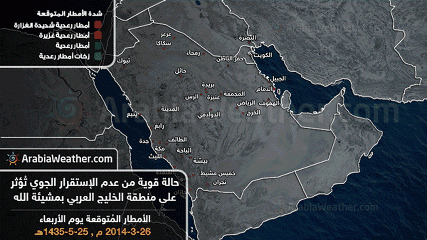 ويحتمل ان تتأثر العاصمة الرياض بعواصف رعدية خاصة الاجزاء الشرقية منها ، قد تترافق العواصف الرعدية مع رياح هابطة تصل سرعتها الى 70كم/ساعة، كذلك من المحتمل ان تترافق مع تساقط البَرَد.