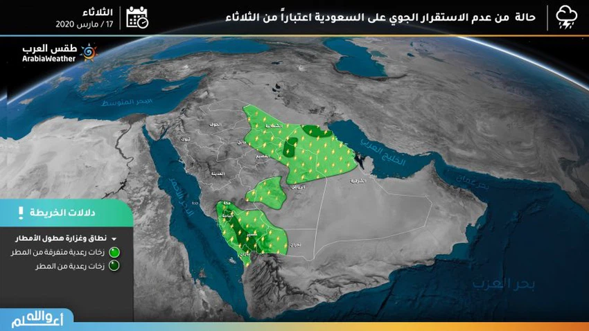 طقس العرب - تتأثر مناطق واسعة من السعودية بحالة منعدم الاستقرار الجوي اعتبارا من يوم الثلاثاء حيث تتكاثر الغيوم متوسطة الارتفاع و الغيوم الركامية وتهطل زخات رعدية من المطر تشمل العاصمة الرياض.
