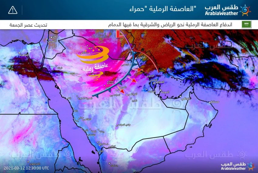 وقد تشكلت أولى الموجات الغبارية صباح اليوم في الجوف وغرب الحدود الشمالية، والتي سرعان ما تطورت الى درجة عاصفة رملية ضخمة نظرا لاندفاع كتلة هوائية باردة وعبور جبهة هوائية باردة ورياح شديدة مرافقة للمنخفض الجوي الذي يتمركز الى الشمال من الجزيرة العربية، حيث تتحرك العاصفة الرملية "حمراء" نحو الجنوب والشرق، لتشمل عموم المناطق الشرقية والوسطى بما فيها مدينة الرياض.