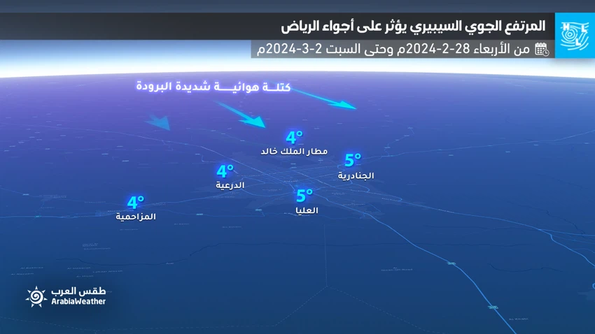 طقس العرب - سنان خلف - نبه كادر التنبؤات الجوية في مركز طقس العرب الإقليمي من الإنخفاض الحاد والكبير على درجات الحرارة الذي ستشهده عموم منطقة الرياض، بما في ذلك الأجزاء الداخلية من مدينة الرياض، كنتيجة لامتداد المرتفع الجوي السيبيري وتعمقه سريعاً في أجواء المملكة.