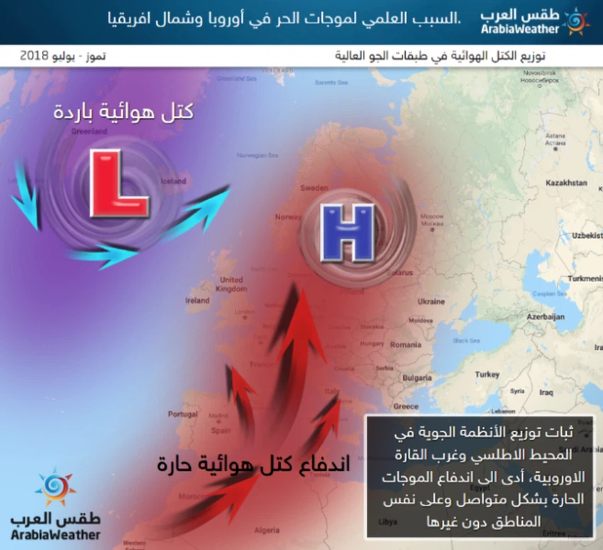 لعل السبب المباشر والأبرز في تعرض مناطق وسط وغرب وجنوب القارة الأوروبية بما في ذلك الدول الاسكندنافية وأجزاء من الجزر البريطانية للموجات الحارة، يكمن في ثبات توزيع الأنظمة الجوية شمال المحيط الأطلسي والذي أدى بدوره الى اندفاع موجات حارة بدءاً من شمال القارة الأفريقية لاسيما الجزائر، امتداد الى القارة الأوروبية.