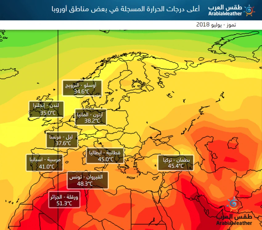 ولأيام عديدة متواصلة، استمر اندفاع الكتل الهوائية الحارة على نفس المناطق دون غيرها، الأمر الذي أدى الى ارتفاع كبير على درجات الحرارة على تلك المناطق، وصل أعلاها في ورقلة – الجزائر الى 51.3 درجة مئوية، فيما عمت مناطق واسعة من شمال وغرب القارة الأوروبية درجات حرارة في مستويات تراوحت بين منتصف الثلاثينات والأربعينات مئوية.
