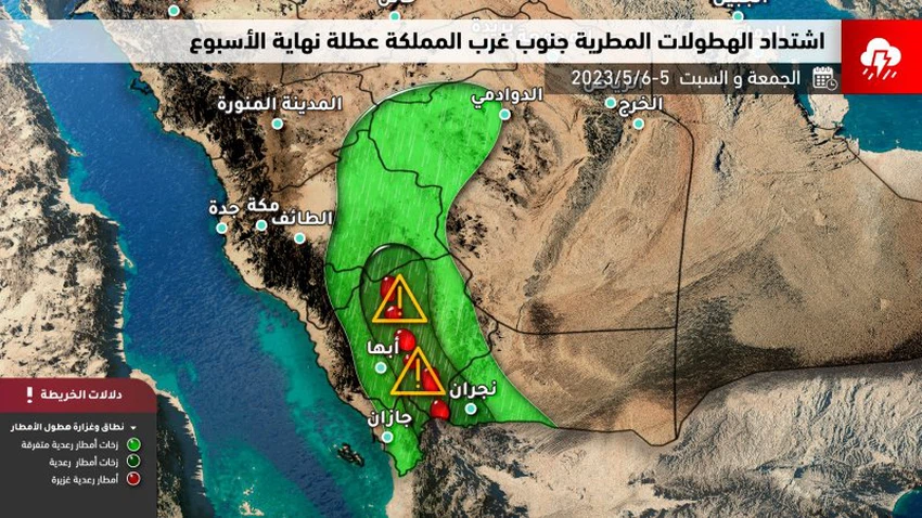 طقس العرب - تُشير آخر نواتج المُحاكاة الحاسوبية في مركز طقس العرب توقعات باشتداد الأمطار الرعدية على المناطق الجنوبية الغربية يومي الجمعة و السبت 5 و 6 أيار 2023، و يتزامن ذلك مع نشاط للرياح المُثيرة للأتربة و الغبار في مناطق عِدّة من المملكة بمشيئة الله.