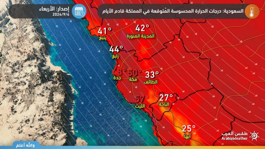 و يُتوقع بمشيئة الله أن يستمر تأثر المناطق الساحلية بموجات من الرطوبة خاصة منطقة مكة المكرمة و مدينة جدة، و بالرغم من بلوغ درجات الحرارة بداية الأربعينيات مئوي في العاصمة المقدسة و في نهاية الثلاثينيات في جدة، إلا أن الحرارة المحسوسة تتجاوز ذلك بكثير و تصل إلى 50 درجة مئوية، بحيث يكون الطقس مُرهق للغاية.