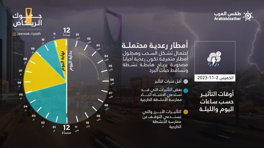 و من المُنتظر بمشيئة الله أن تتأثر أجزاء عديدة من منطقة الرياض و بخاصة المُحافظات الشمالية منها بتكونات من السُحب الركامية على فترات من يوم الخميس و تترافق هذه السُحب بهطول أمطار مُتوسطة قد يتخللها بعض البؤر الغزيرة محلياً و التي يصحبها حدوث العواصف الرعدية أحياناً و نشاط في التيارات الهابطة المُفاجئة.