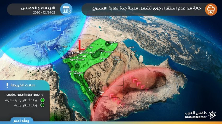 تقترب كتلة هوائية باردة من شمال المملكة يوم الأربعاء، حيث تعمل هذه الكتلة الهوائية على اتساع رقعة حالة عدم الاستقرار الجوي في غرب المملكة، لتشمل كل من مناطق جازان وعسير والباحة ومكة المكرمة ومنطقة جدة بما فيها مدينة جدة، ثم تمتد لاحقا نحو غرب وشمال منطقة الرياض ومنطقة القصيم ووصولاً لحفر الباطن.
