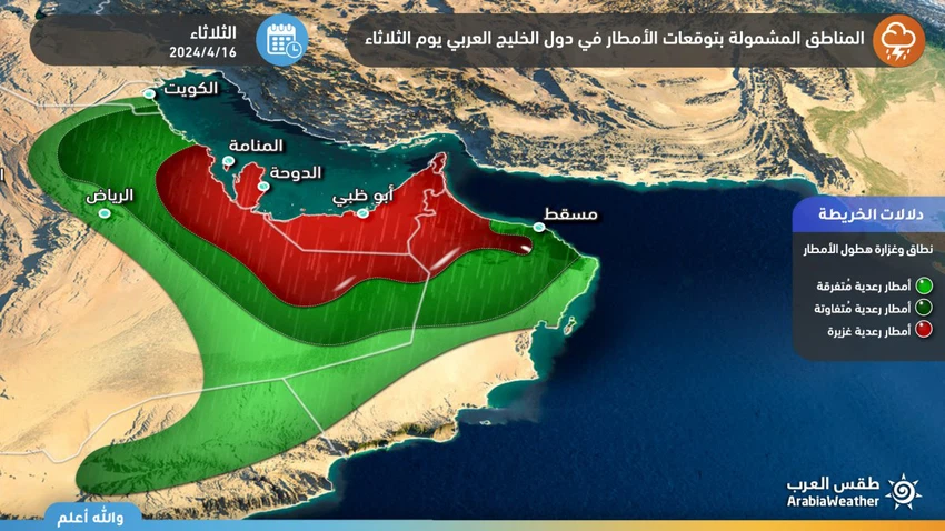 طقس العرب - لايزال فريق التنبؤات الجوية في "مركز طقس العرب الإقليمي" يُتابع على مدار الساعة مُستجدات وتطورات الحالة المطرية الاستثنائية المُتوقع تأثيرها على البلاد تدريجياً اعتباراً من الأحد وحتى يوم الثلاثاء، والتي تتضمن العديد من الظواهر الجوية المؤثرة، من امطارٍ غزيرة ورياحٍ هابطة موجاتٍ من الغبار وزخاتٍ من البَرَد.