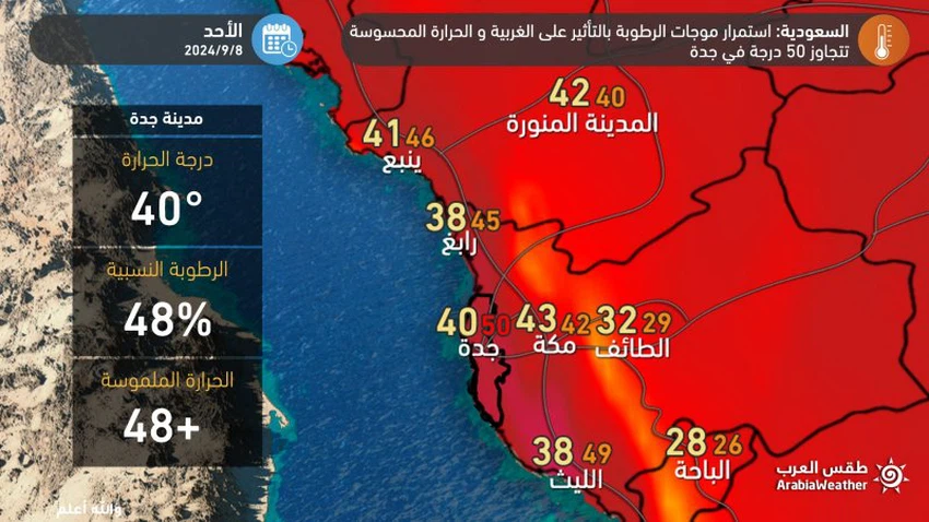 و قال المُختصون في مركز طقس العرب بأنه يُتوقع أن تكون الحرارة المُسجلة في جدة حوالي 37-40 درجة مئوية خلال الأيام القادمة، و لكن مع بلوغ الرطوبة النسبية حوالي 50%، يؤدي ذلك إلى ازدياد الشعور بالحر بشكل كبير، بحيث تقترب من 50 درجة مئوية على سواحل مكة المكرمة بما فيها جدة و الليث.