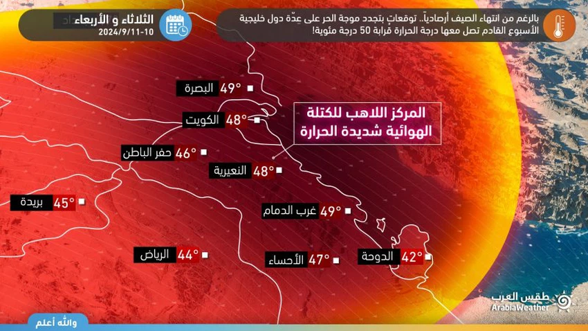 كما و يُتوقع أن ترتفع درجات الحرارة المُسجلة على أجزاء من شرق و وسط المملكة منتصف الأسبوع الحالي، بحيث تتجاوز 45 درجة مئوية في مُحافظات عِدّة و تقترب من 50 غرب الدمام و النعيرية و المُدن المجاورة.