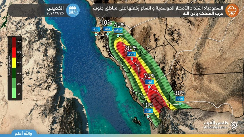 و قال المُتنبئون الجويون في مركز طقس العرب بأنه يُتوقع أن تشتد الأمطار الموسمية على جنوب غرب المملكة نتيجة توغل الحزام المداري الوهمي لجنوب شبه الجزيرة العربية و يترافق بتدفق رطوبي من مناطق استوائية، و تتهيأ الفرصة تدريجياً بعد الظهر و المساء من يوم الخميس على مُرتفعات جازان و عسير و الباحة وصولاً لشرق مكة المكرمة و يُرافقها هطول أمطار مُتفاوتة الغزارة مصحوبة بحدوث العواصف الرعدية و تساقط البَرَديات، مما يؤدي إلى جريان للأودية و الشِعاب.