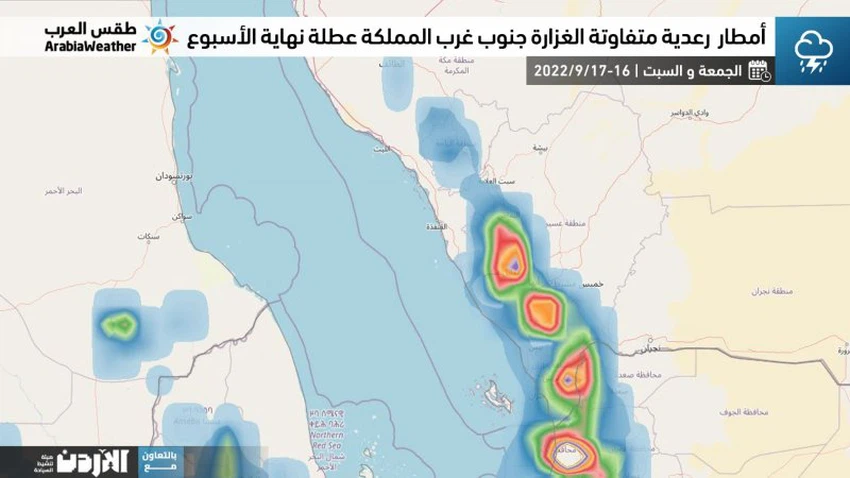 وفي التفاصيل، يُتوقع أن تنشط السحب الركامية يومي الجمعة و السبت على مُرتفعات وتُهامة جازان و عسير وأجزاء من مُرتفعات الباحة و جنوب مكة المكرمة، لتهطل زخات من الأمطار ذات الشدّة المُتفاوتة، تكون غزيرة في بعض الأحياء وتترافق مع تساقط البَرَد ومُترافقة بِحُدوث العواصف الرعدية أحياناً، مما قد يتسبب بِجريان الأودية والِشعاب في بعض المناطق ورُبما تشكل السيول خاصةً يوم السبت.