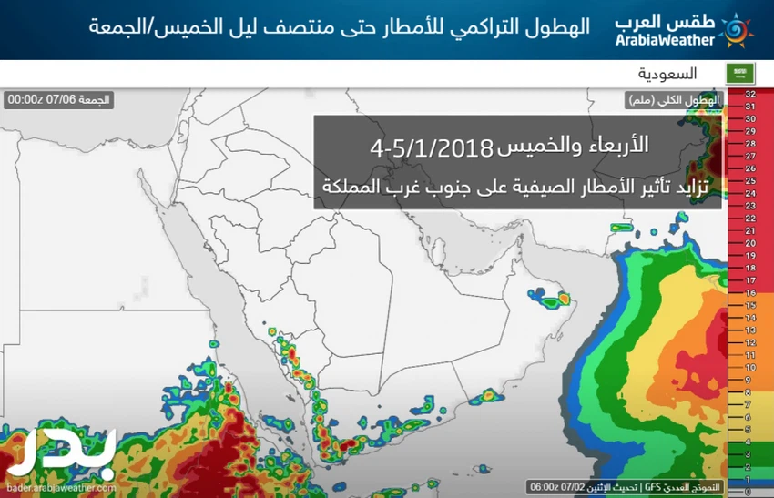 طقس العرب – سنان خلف – تُشير آخر المعلومات الجوية الصادرة عن "مركز طقس العرب الإقليمي" إلى تأثر المرتفعات الجنوبية الغربية يومي الأربعاء والخميس بحالة من عدم الإستقرار الجوي، تُعتبر أكثر شدة مُقارنة بالأيام الماضية، وتعمل بمشيئة الله على تساقط زخات رعدية من المطر
