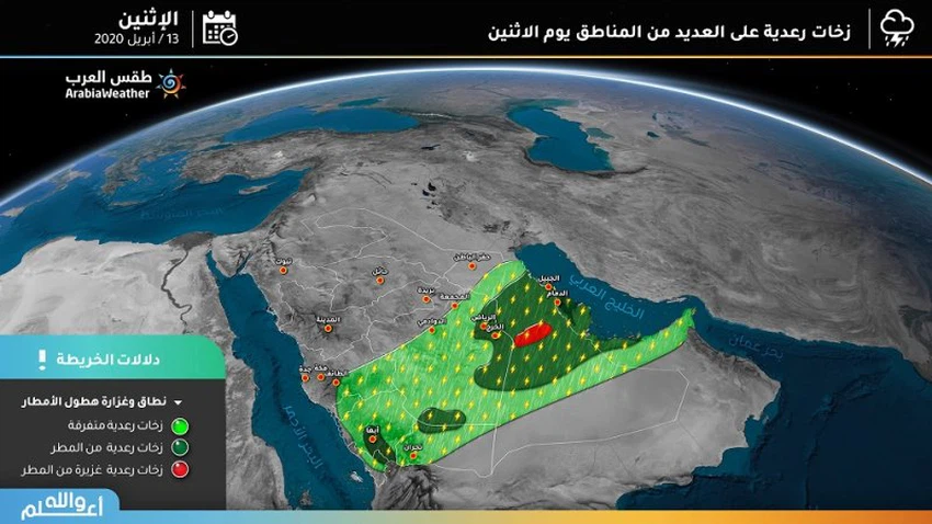 تتكاثر الغيوم المتوسطة الارتفاع و الركامية تدريجيا فوق العديد من اجزاء منطقة الرياض و الشرقية و الاحساء اعتبارا من ليلة الاحد/الاثنين و خلال ساعات نهار يوم الاثنين حيث تهطل زخات تكون رعدية احيانا في تلك المناطق تشمل كل من العاصمة الرياضو مدينة الدمام و الهفوف.