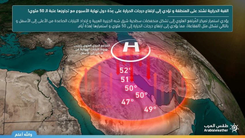 طقس العرب - يُراقب المُختصون في "مركز طقس العرب الإقليمي" وعلى مدار الساعة ما تُشير إليه آخر مُخرجات أنظمة المُحاكاة الحسوبية الخاصة بحركة الأنظمة الجوية، من تعاظم تأثير المرتفع الجوي العربي وسيطرة القبة الحرارية بشكل فعّال على أجواء المنطقة، مُنذرة بطقس لاهب قد يكون الأشد حرارة منذ بداية الصيف الحالي.