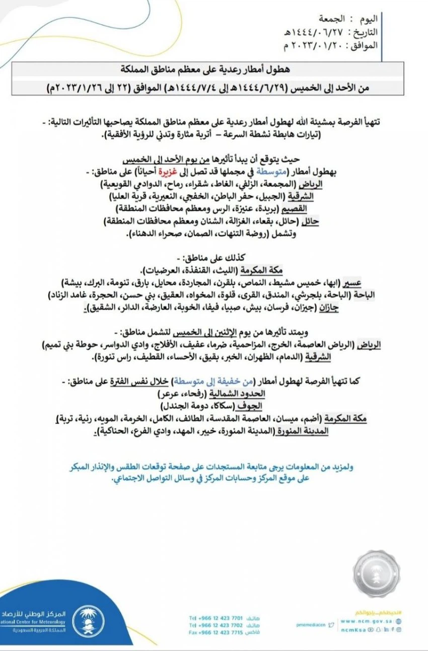 وبحسب التقرير فيُتوقع أن تشمل الحالة الماطرة كُل من كل من الرياض وحائل والقصيم والجوف والحدود الشمالية والشرقية ومكة المكرمة والمدينة المنورة وعسير، وفيما يلي نص التقرير: