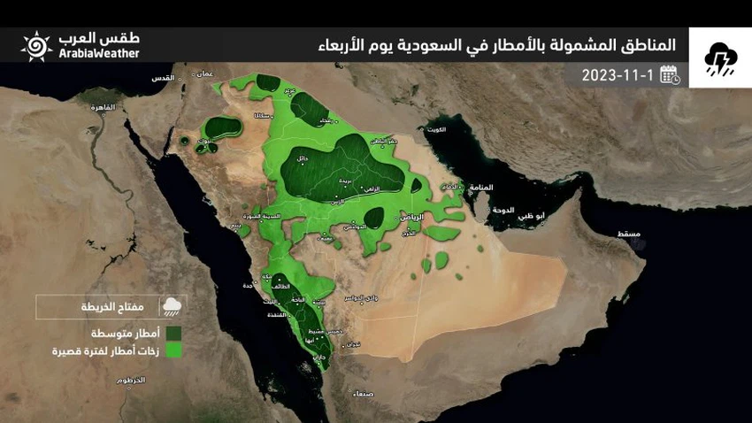 طقس العرب - تُشير أحدث الخرائط الجوية في مركز طقس العرب الإقليمي توقعات بأن يتزايد تأثر مناطق عديدة من المملكة السعودية يوم الأربعاء بالأحوال الجوية غير المُستقرة و يُرافقها هطول أمطار مُتفاوتة الغزارة مصحوبة بحدوث البرق و الصواعق و الرعد بالإضافة إلى نشاط كبير في سرعة الرياح بشكل مؤفت أبان مُرور السُحب الرعدية.