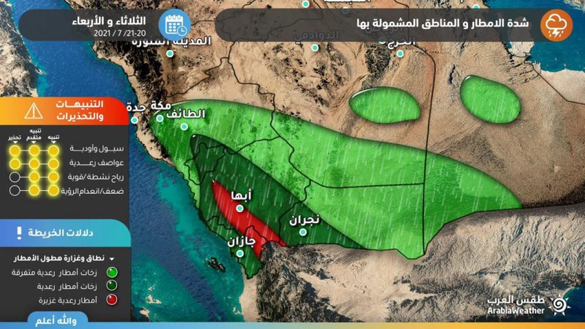 وبحسب آخر ما صدر من مُخرجات النماذج العددية فيُتوقع أن تكون مرتفعات جازان و عسير يومي الثلاثاء تحت تأثير سُحب ركامية تتسم بالقوة، وستزداد شدة بشكل اضافي يوم الأربعاء، تحمل معها الأمطار الرعدية الغزيرة وزخات من البرد التي ستكون كثيفة ومتراكمة احياناً، مع فرصة عالية لتشكل السيول خاصة في المناطق المنخفضة والمنحدرات الجبلية، وقد تمتد بعض هذه السحب نواحي الباحة وامتداداً حتى الطائف و الأجزاء الشرقية من منطقة مكة المكرمة ولكن بشدة أقل.