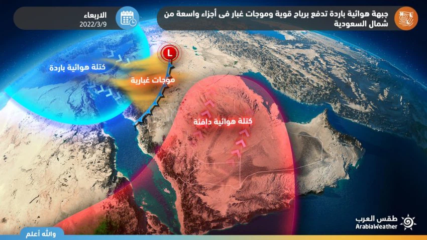ومع ساعات مساء وليل الأربعاء/الخميس تبدأ الجبهة الهوائية الباردة بعبور الأجزاء الشمالية من السعودية، ليطرأ إنقلاب جذري على الأجواء في تلك المناطق بالتزامن مع نشاط كبيرة في سرعة الرياح.