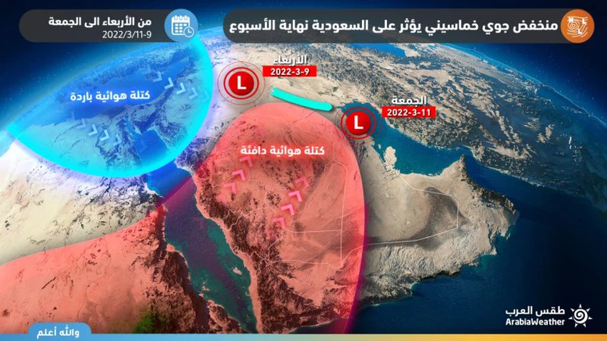 وفي التفاصيل، يقترب منخفض جوي خماسيني من المملكة قادماً عبر الاراضي المصرية اعتباراً من يوم الأربعاء 9 مارس 2022، ويتمركز المُنخفض الجوي العميق جنوب الأراضي العراقية، وبسببه تتحرك تيارات جنوبية غربية دافئة ترتفع على إثرها درجات الحرارة في أغلب المناطق خاصةً في المناطق الغربية والشمالية من المملكة لتصبح الاجواء دافئة وأقرب ما تكون للصيفية ودرجات الحرارة في أواسط الثلاثينات مئوية.