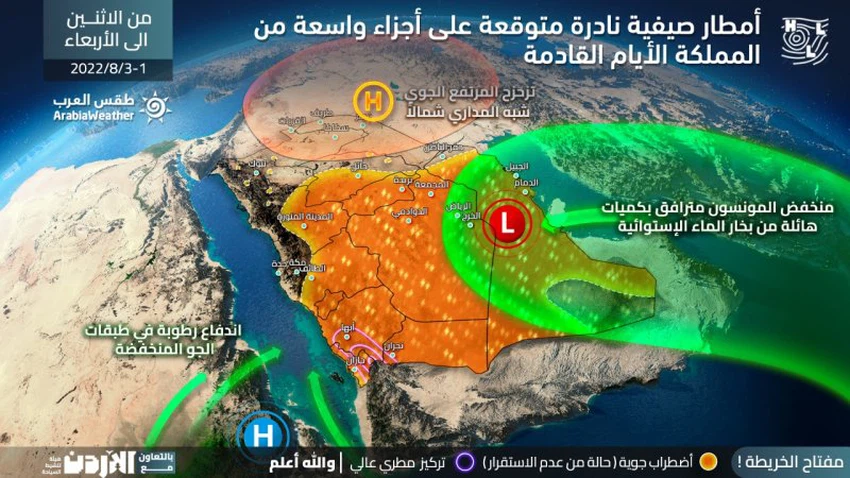 وبحسب ما تُشير إليه مُخرجات النمذجة الحاسوبية تلك المُطورة في مركز طقس العرب فيُتوقع أن يتعمق مُنخفض المونسون لأجواء المملكة يوم الإثنين 1-8-2022 مُترافقاً بكميات هائلة من بخار الماء الإستوائي، مُسبباً نشوء أحوال جوية غير مُستقرة تتمثل بتطورات لِسُحب ركامية رعدية مُمطرة في مناطق مُتفرقة من شرق ووسط وجنوب المملكة، بحيث تتجدد فُرص الأمطار على المنطقة الشرقية ولا يُستبعد أن تشمل فرص الأمطار الدمام وأجزاء واسعة من منطقة الرياض بما في ذلك العاصمة بالَإضافة إلى القطاع الجنوبي الغربي من المملكة، وتكون الأمطار غزيرة أحياناً وتتسبب بإرتفاع منسوب المياه بالطرقات في بعض المناطق بالإضافة إلى أنها تُسبق في العديد من الأحيان بنشاط كبير في سرعة الرياح التي قد تتسبب في تشكل عواصف ترابية محلية.