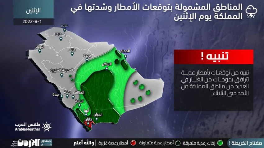 وبحسب آخر القراءات الجوية فإن المؤشرات تُشير إلى استمرار تأثير الحالة الماطرة على أجزاء عشوائية الطابع من شرق ووسط وجنوب المملكة يومي الثلاثاء والأربعاء 2 و 3 أغسطس 2022 مع امتداد فُرص الأمطار لأجزاء من شمال غرب المملكة، بحيث يستمر فُرص هطول أمطار رعدية على بعض المناطق الداخلية من المنطقة الشرقية وأجزاء عِدّة من منطقة الرياض إدارياً ولا يُستبعد أن تتجدد الأمطار الرعدية على العاصمة الرياض بالإضافة للمُرتفعات الجنوبية الغربية من المملكة والربع الخالي، وتكون الأمطار غزيرة أحياناً وتتسبب بإرتفاع منسوب المياه بالطرقات بالإضافة إلى أنها تُسبق في العديد من الأحيان بنشاط كبير في سرعة الرياح التي قد تتسبب في تشكل عواصف ترابية محلية.