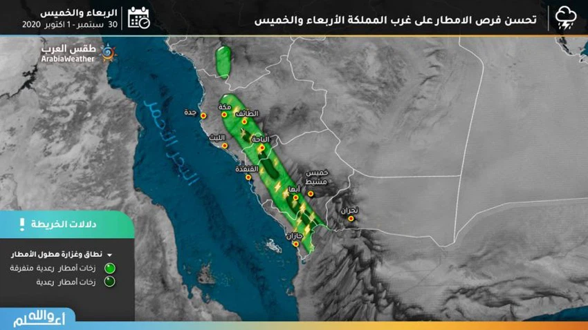 ويُتوقع أن تبدأ التقلبات الجوية على هذه المناطق اعتياراً من ساعات ما بعد ظُهر يوم الأربعاء، ويُتوقع تكاثر السُحب الركامية الرعدية وتساقط الأمطار، تكون أكثر غزارة وشدة في مرتفعات جازان وعسير، وقد تعمل على جريان الأودية والشعاب في هذه المناطق.
