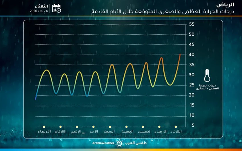وتشير التوقعات الخاصة بدرجات الحرارة في العاصمة الرياض إلى انخفاضها بشكل كبير وغير مُعتاد، بحيث تبدأ بالانخفاض تدريجياً اعتباراً من يوم الأربعاء من أوائل الأربعينيات مئوية إلى منتصف الثلاثنيات نهاية الأسبوع، ثم إلى قرابة الـ 30 درجة مئوية منتصف الأسبوع القادم، وقد تنخفض الصغرى إلى ما دون الـ 20 درجة مئوية منتصف الأسبوع القادم.