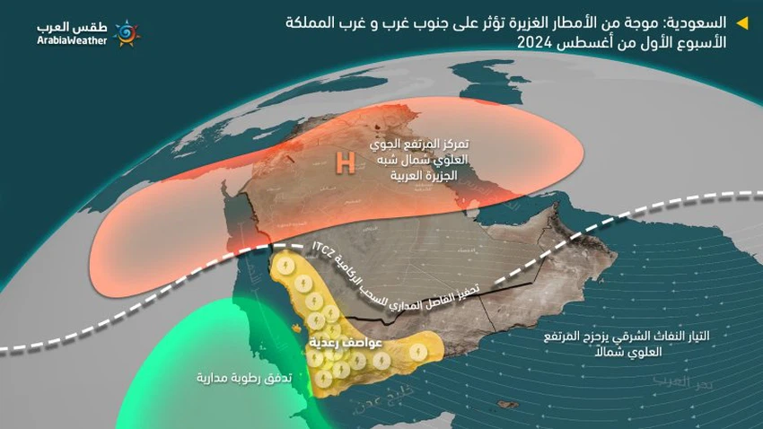 من مركز طقس العرب - تُشير آخر القراءات الجوية بأنه يُتوقع أن يحدث تغير على توزيع الأنظمة الجوية في المنطقة خلال الأسبوع الأول من أغسطس 2024 و يتمثل ذلك بتزحزح للتيار النفاث الشرقي للمُرتفع الجوي في طبقات الجو العالية نحو شمال شبه الجزيرة العربية، و مع استمرار نشاط الحزام المداري الوهمي ITCZ يؤدي ذلك إلى اشتداد الأمطار الموسمية على جنوب غرب و غرب المملكة السعودية بإذن الله.