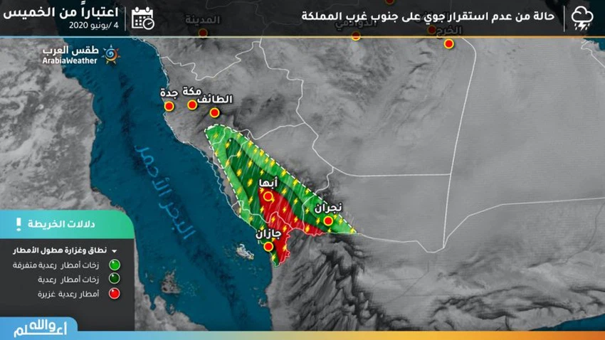 طقس العرب - سنان خلف - من المُتوقع بمشيئة الله أن يستمر تأثر الأجزاء الجنوبية الغربية من المملكة يومي الجُمعة والسبت بحالة من عدم الإستقرار الجوي، تعمل على تكاثر السُحب الركامية الرعدية في ساعات الظهر والعصر وتساقط الأمطار.