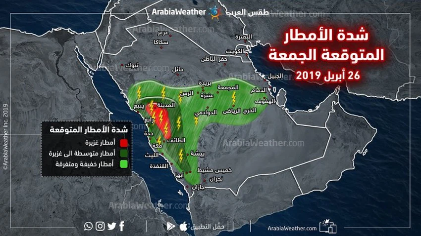 اعتباراً من يوم الجمعة 26-04-2019 تتركز الحالية مع ازدياد تعمق منخفض البحر الأحمر داخل الاراضي السعودية مما يعمل على اشتداد حالة عدم الاستقرار وتكون الفرص مهيأة لهطول زخات رعدية وغزيرة احياناً تترافق بزخات من البرد مع نشاط سطحي للرياح المصحوبة بهبات قوية احياناً على أجزاء واسعة من غرب السعودية خاصة منطقة المدينة المنورة ثم تنتقل الفرص لتشمل الأجزاء الغربية من وسط المملكة، مع فرص لهطول زخات متفرقة من المطر على العاصمة الرياض بمشيئة الله.