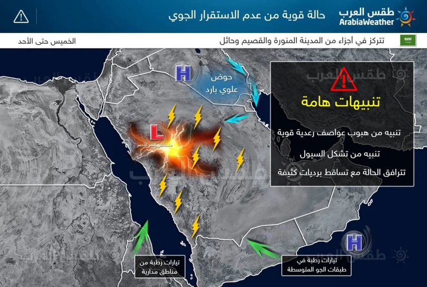 طقس العرب - سنان خلف - يبدو أن المملكة العربية السعودية بمناطقها الغربية والوسطى على اعتاب حالة قوية من عدم الاستقرار الجوي، تتركز في شدتها وبردياتها على حائل و منطقة المدينة المنورة، تبدأ بالتأثير على المنطقة اعتباراً من يوم الجمعة.