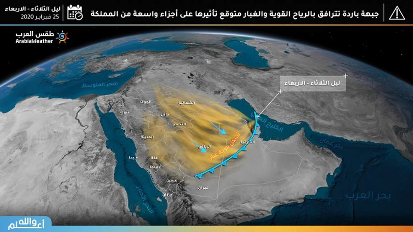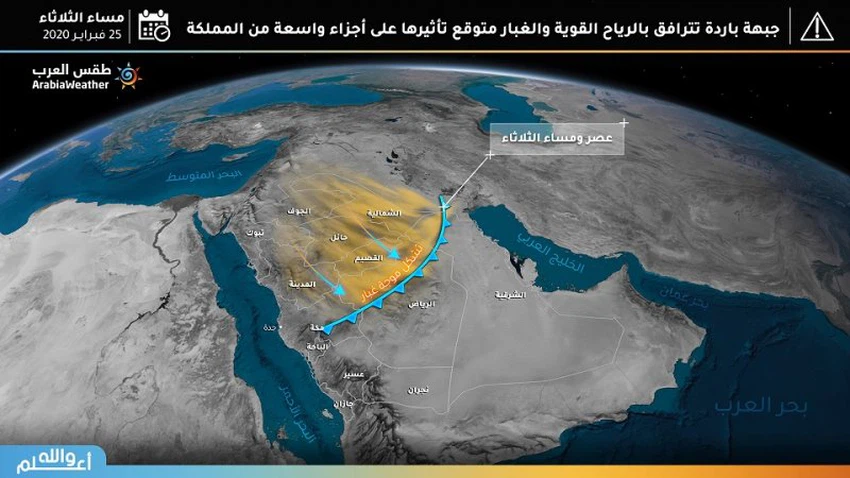 ومع ساعات المساء والليل تتحرك الجبهة الباردة نحو الأجزاء الوسطى من المملكة، وتبدأ يعبور أجواء العاصمة الرياض، وتدفع بالرياح القوية الغبار من الأجزاء الشمالية والشمالية الغربية مباشرة نحو العاصمة، مصحوبة بهبات تكون ما بين 60-70 كم/ساعة، لتسيطر على العاصمة الرياض أجواء مغبرة بشكل لافت مع تدني كبير في مدى الرؤية الافقية.