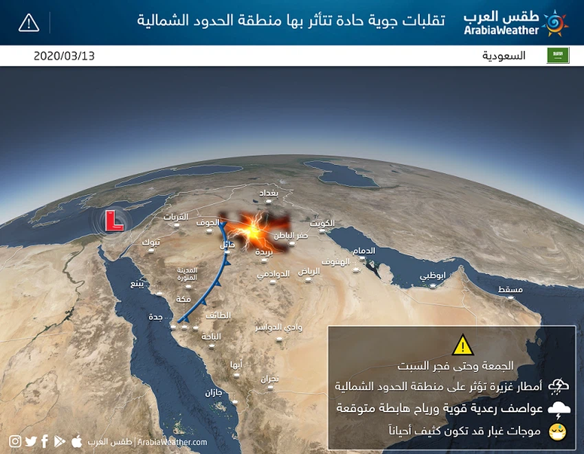 وتثشير آخر التوقعات الجوية لدينا في طقس العرب إلى تركز التقلبات الجوية الحادة هذا اليوم الجمعة وحتى فجر يوم غدٍ السبت في منطقة الحدود الشمالية، حيث يُتوقع أن تشهد كُل من العويقيلة ورفحاء بشكل خاص مع ساعات مساء اليوم الجمعة هطول أمطار غزيرة تترافق بالعواصف الرعدية والرياح الهابطة وربما موجات الغبار الكثيف التي تسبق هطول الامطار، على أن تتحرك هذه السُحب في ساعات مابعد منتصف الليل وحتى فجر السبت لتؤثر على حفر الباطن ولكن بشكل ضعيف مُقارنة بما ستشهده العويقيلة ورفحاء.