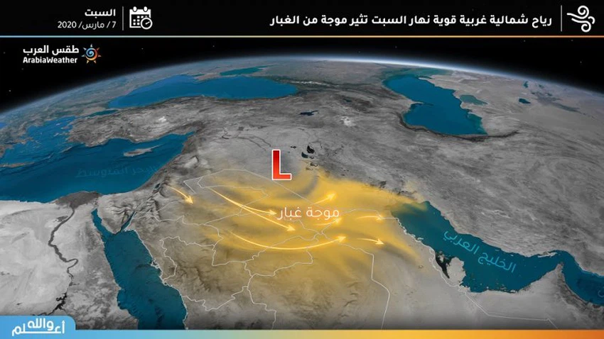 طقس العرب - سنان خلف - من المُتوقع بمشيئة الله أن تتأثر الأجزاء الشمالية من المملكة مُجدداً نهار يوم السبت برياح شمالية غربية نشطة إلى قوية السرعة، تعمل على إثارة موجة جديدة من الأتربة والغبار.