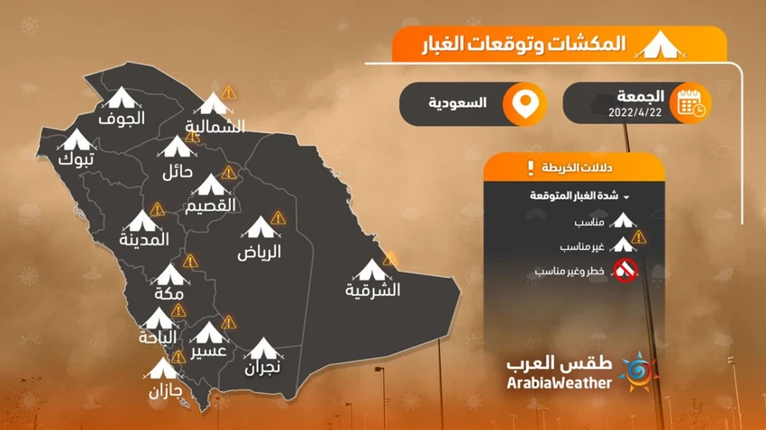 وفي التفاصيل فيُتوقع أن يستمر تاثر المملكة يوم الجمعة بالحوال الجوية غير المستقرة، بحيث تتشكل السحب الرعدية من جديد مع ساعات الظهر والعصر على طول المرتفعات الجنوبية الغربية والغربية وسفوحها الشرقية، اضافة لأجزاء من الرياض وحائل والقصيم والمدينة المنورة وصولاً حتى الحدود الشمالية، وعلى اثر ذلك ستكون هذه المناطق عرضة لتساقط زخات من الأمطار، قد تسبق بنشاط للرياح الهابطة المثيرة للأتربة والغبار، ما يجعل الجواء غير مُناسبة للكشتات والجلسات الخارجية.
