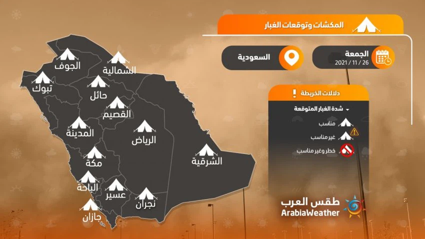 أما يوم السبت فيبقى الطقس مناسباً للكشتات البرية في أغلب المناطق، كما وتستمر فرص الأمطار بمشيئة الله على مرتفعات جازان وعسير، قد تكون غزيرة احياناً في نطاقات جغرافية ضيقة، لكنها ستكون جاذبة لعشاق الكشتات