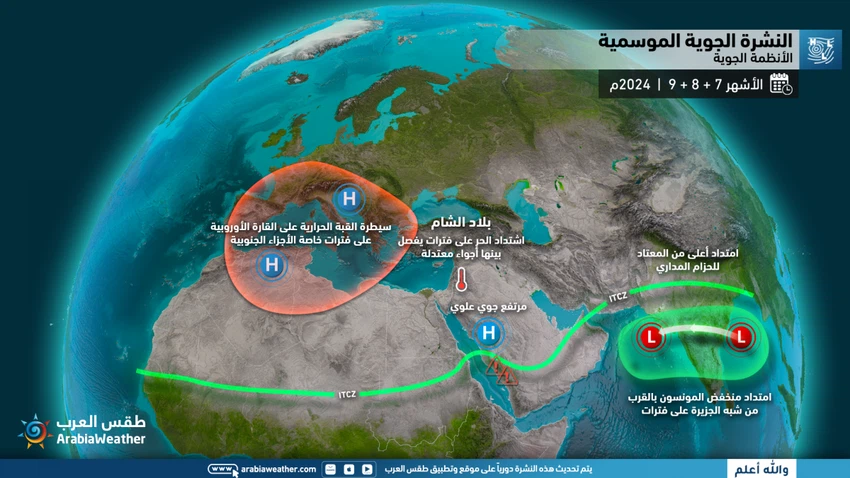 طقس العرب - أصدر فريق التنبؤات الجوية في "مركز طقس العرب الإقليمي" توقعاته للأنظمة الجوية السائدة خلال فصل الصيف لهذا العام 2024م، وانعكاساتها المباشرة على حالة الطقس، والتي تشير وبشكلٍ واضح إلى احتمالية تأثر المملكة بعدة موجات حارة، واحتمالية اندفاع موجات رطبة تؤدي إلى حدوث بعض الحالات المطرية خاصة على الأجزاء الجنوبية من السعودية، وفيما تفاصيلها: