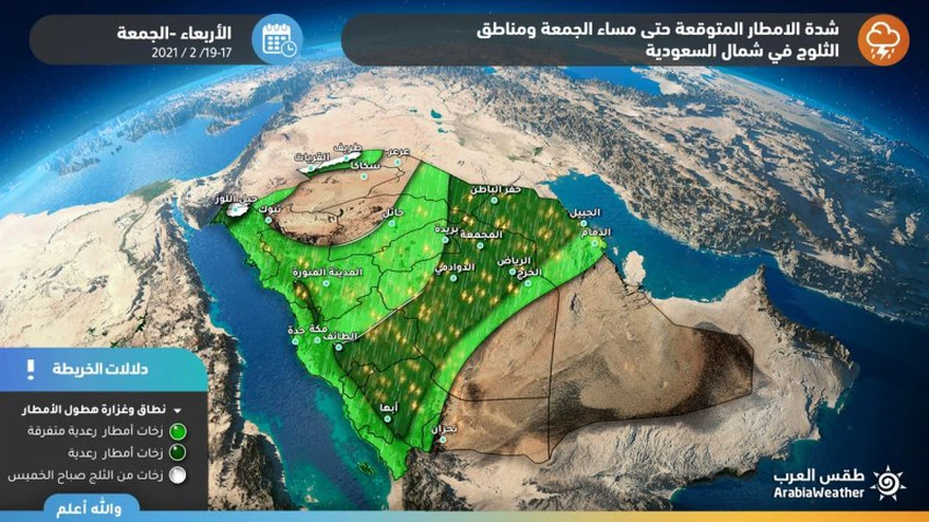 وبالتزامن مع عبور جبهة هوائية باردة لأجواء المنطقة مع ساعات مساء يوم الأربعاء، يتشكل حزام من السُحب الممطرة من شمال منطقة حفر الباطن وصولا حتى الأجزاء الجنوبية من جدة، ويحرك هذا الحزام سريعاً مع ساعات الليل ليؤثر على حفر الباطن بشدة متوسطة، ثم منطقة القصيم وصولاً حتى الطاف والباحة ولكن بشكل ضعيف، ومع ساعات فجر وصباح يوم الخميس يتحرك الحزام الماطر نحو الجنوب ليؤثر على الأجزاء الشمالية من منطقة الرياض، وعموم سواحل المنطقة الشرقية بما في ذلك مدينتي الدمام والرياض، يكون على شكل زخات متفرقة ضعيفة إلى متوسطة الشدة.
