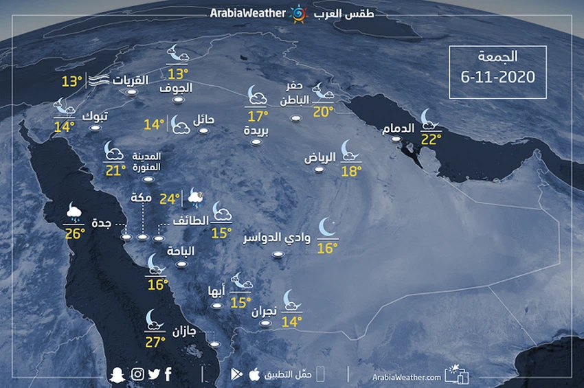 طقس العرب - حالة الطقس ودرجات الحرارة المتوقعة في المملكة العربية السعودية ليوم الجمعة 2020/11/6م