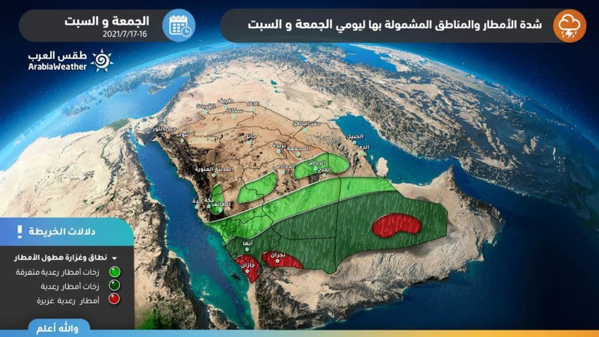 طقس العرب – سنان خلف - من المُنتظر أن تتأثر أجزاء واسعة من المملكة بمشيئة الله اعتباراً من يوم الجمعة بحالة قوية عدم الإستقرار الجوي، تحمل معها الأمطار الرعدية الغزيرة للعديد من مناطق المملكة.