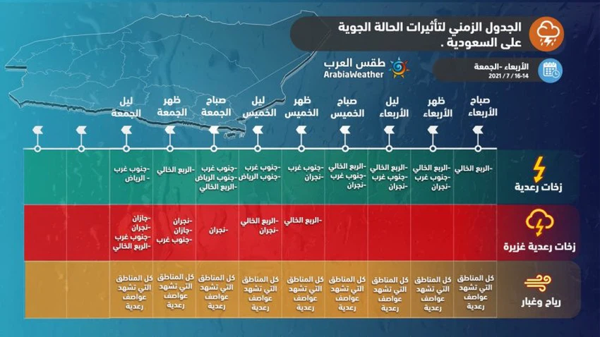 وفي التفاصيل فُتوقع أن تتأثر عُموم الأجزاء الجنوبية من المملكة اعتباراً من مساء يوم الجمعة بتقلبات جوية حادة يُتوقع لها أن تستمر بشدة متفاوتة على مدار الأسبوع القادم، ويُتوقع أتشمل الأمطار الرعدية كُل من صحراء الربع الخالي و نجران والأجزاء الجنوبية من منطقة الرياض.