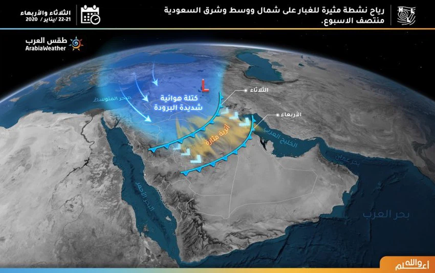 طقس العرب - سنان خلف - تندفع بمشيئة الله نحو الأجزاء الشمالية من المملكة كتلة هوائية شديدة البرودة يومي الثلاثاء والأربعاء، تتمركز هذه الكتلة في سماء منطقة الحدود الشمالية، وتدفع برياح نشطة السرعة في مناطق واسعة.